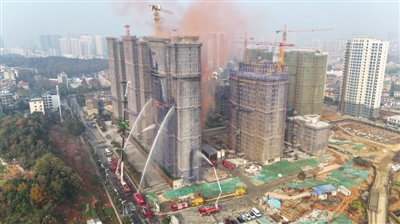 演练模拟茂华央著高层建筑10层发生火灾,火势迅速向顶层蔓延。现场浓烟滚滚,火舌不断上蹿。随着指挥员一声“起飞”指令,搭载灭火弹的无人机迅速升空,在百米高空精准锁定着火点,投下灭火剂。白色泡沫倾泻而下,有效压制了明火。
