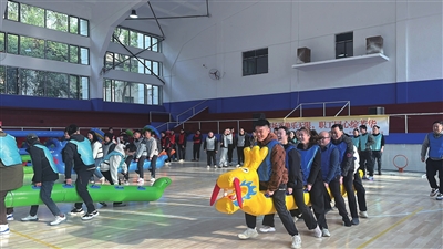 赛场之上,趣味与竞技交织,激情与欢笑碰撞。障碍四件套赛道上,队员们身手矫健,跨越障碍、穿梭通道,每一个敏捷的身影都像离弦的箭,朝着终点奋力冲刺,队友们的呐喊助威声此起彼伏,为奔跑的身影注入源源不断的动力;旱地龙舟项目中,20人一组的队伍紧紧抓住充气龙舟,喊着整齐划一的口号,步伐协调一致,如同真正的龙舟在陆地上“乘风破浪”,红色的龙舟在赛场上穿梭,成了一道流动的风景线;同心鼓前,队员们围站成圈,目光紧紧锁定空中的排球,双手默契配合,随着鼓面的起伏调整力度与节奏,排球在鼓面上轻盈跳跃,仿佛一颗跳动的心脏,牵动着每一个人的神经,考验着团队的协作与默契;真人冰壶赛中,队员们屏气凝神,精准发力,看着冰壶在赛道上缓缓滑行、精准落位,每一次成功的投掷都引来阵阵欢呼,展现出“静中有动”的智慧与从容。