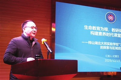 集中会议阶段,咸宁北大邦实验学校党支部书记、校长纪曹文以《生命教育为根,教研体系为擎:构建素养时代课堂新样态——梓山湖北大邦实验学校“三自·学品课堂”的探索与区域启示》为题,带来了一场兼具理论高度与实践温度的专题分享。作为湖北省教育学会教育专业委员会校长智库专家组成员、全国教育科研先进个人、“咸安区纪曹文名校长工作室” 领衔人,纪曹文围绕“政策背景解读、教育本质追寻、课改价值取向、育人体系构建、课堂生态支撑、教师转型驱动、实践成效辐射、未来深化方向、教育初心坚守”九个维度,系统拆解了该校课改的“前世今生”与“独门秘籍”。