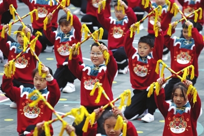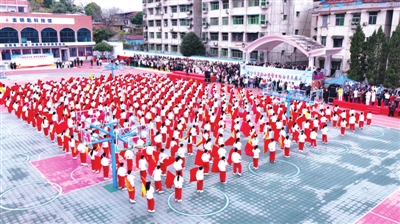 系列活动期间,学校田径运动场化作素质教育成果的展示舞台,一场场精彩展演轮番上演,尽显实小学子的昂扬风采。金钥匙管乐团的演奏气势恢宏,奏响时代强音;四年级 800 名学生演绎的团体操《桂落舞芳辰》,以金黄桂叶为道具,再现 “打桂花” 的乡土诗意,将地域文化与肢体艺术完美融合;六年级千名学生共同奏响的巴乌合奏《美妙巴乌情》,作为引入课堂十年的非遗特色项目,千管齐鸣、韵味悠长,彰显了文化传承与美育融合的深厚积淀;五年级 400 名学生演绎的红旗操《红旗映丹心》,以整齐队列摆出寓意深刻的造型,用赤诚童心诠释爱国情怀。