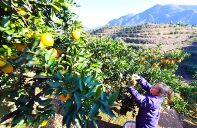 近日,通山县大畈镇富水湖畔芦泉山桔橙产业基地,桔橙迎来丰收,游人、果农穿梭果园采摘,同享丰收的喜悦。在“公司+基地+农户”的发展模式下,该基地已形成3000余亩桔橙连片产区,将闲置山地开发利用起来,带动农户增收。