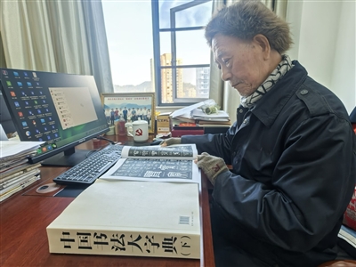 “没想到我写的字能跟全国这么多名家收录在一起,真是太开心了!”衣着朴素,戴着绒帽,身体硬朗的周天坤老人,拿着《中国书法大字典》翻开书页,指着自己被收录的字,言语间满是欣喜与自豪。