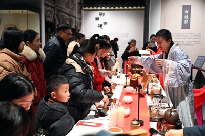 二楼体验区同样人流如织。“青砖茶时光机”前,游客们跟随老师体验唐代烹茶、宋代点茶的雅趣;叶雕技艺区内,大家在非遗传承人的指导下执刀雕刻,将新年祝愿镂刻于叶脉之间;“元曲对对碰”“文物猜猜猜”等互动游戏,也吸引不少人打卡盖章、玩得不亦乐乎。最终,完成任务的游客纷纷来到兑奖处转动幸运转盘,收获小白马、红包、发饰等文创好礼,脸上洋溢着喜悦与满足。