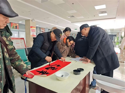 前来办理业务的退伍老兵和家属被墨香吸引,纷纷驻足欣赏、挑选对联。协会工作人员细心晾干墨迹,将春联一一送到退伍老兵手中。