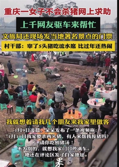1月9日凌晨,呆呆发布了一条视频称:“1月11日我家要杀两头猪,有人来帮我按猪吗?请你吃刨猪汤!父亲年纪大了,我怕他按不过猪。”她还在评论区发了自家地址。