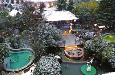1月20日,碧桂园凤凰温泉泡池中,游客们正享受着冰火两重天的独特体验。据了解,当天,我市迎来降雪,尽管气温骤降,但各大温泉景区热度不减,来自全国各地的游客在热气蒸腾中感受着咸宁冬日里独有的温暖与惬意。 记者 夏正锋/摄