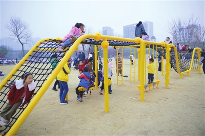 1月18日,城区玉泉街绿地上,新投用了一个大型儿童攀爬设施。明黄色的攀爬架与黑色防护网构成的游乐空间里,孩子们穿梭攀爬、欢笑嬉闹,让这片城市绿地充满了生机与活力。