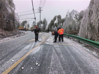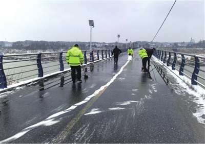 近日,崇阳县迎来2026年初雪,相关部门迅速启动应急预案,开展全方位巡查与除冰工作,全力防范低温雨雪冰冻天气带来的影响。图为公安部门、交通运输部门在重点路段撒布融雪剂和防滑沙,及时清除积雪暗冰,保障全县公路总体通行平稳。