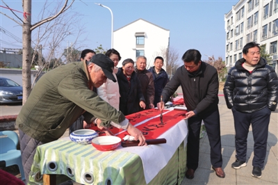 笔落朱砂凝福韵,春藏尺素暖人心。活动现场,长桌齐整排开,大红宣纸铺展如霞,笔墨砚台依次陈列,墨香与空气中的糖果甜香交织,酿成独属新春的温馨气息。书画家们围坐桌前,凝神挥毫间,笔尖在红纸上流转腾挪,“福满人间春常在,寿盈岁月喜长存”“松鹤延年添福寿,春风得意启新程”等一副副笔力遒劲、寓意吉祥的春联与福字跃然纸上。老人们裹着厚外套、戴着棉帽,三三两两围立桌旁,或静赏笔走龙蛇的创作,或低声热议心仪字句,眼神满是期待。78岁的程大爷接过刚写就的春联,小心翼翼托于掌心,眼角皱纹在笑意中舒展:“这字真有神韵,比印刷春联暖多了,贴在屋里,年味儿立马就浓了!”拿到春联的老人皆如获至宝,细心折好揣进怀中,言语间满是对志愿者的感念。