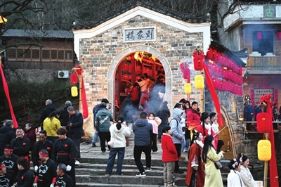 巡游队伍沿青石板路蜿蜒前行。家家户户门前鞭炮炸响,按照传统“接龙”习俗,村民们在龙经过时点燃准备好的鞭炮。青烟缭绕中,金龙时隐时现,宛如游走人间的真龙。