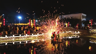 鼓点骤密,五条金丝龙沿河岸排开,时而腾跃,时而盘旋。最精彩的段落出现在18时30分——两侧水面突然爆发出耀眼金光,专业打铁花演员将1600℃的铁水击向夜空,铁花如瀑洒落河面。与之呼应,四条竹筏上的表演者同时舞动钢丝棉,旋转的光环在水面映出绚烂倒影。