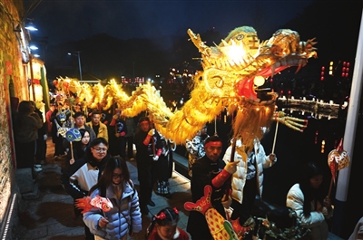 “起——龙!”18时整,两声吆喝划破夜空,焰火棒喷涌出三米高的金色火花。锣鼓齐鸣,五条金丝龙同时昂首,从古宅墨庄轩鱼贯而出。