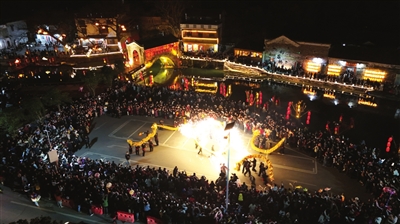 1月28日晚,咸安区桂花镇刘家桥古村落里,一场跨越时空的非遗展演精彩上演。五条金黄色的“天河金丝龙”在暮色中舞动,河面铁花飞溅,岸边鱼灯流转——这项入选市级非遗名录的传统民俗,首次以大型文旅融合形式亮相,吸引了万余游客共同见证。