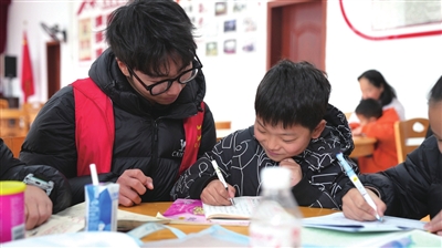 2月3日,在嘉鱼县官桥镇朱砂文化中心的“寒假学堂”内,12名小朋友在4名大学生志愿者的陪伴下,或专注书写寒假作业,或开心地制作手工作品,或积极参与体育项目,室内外洋溢着浓厚的学习与欢乐气氛。