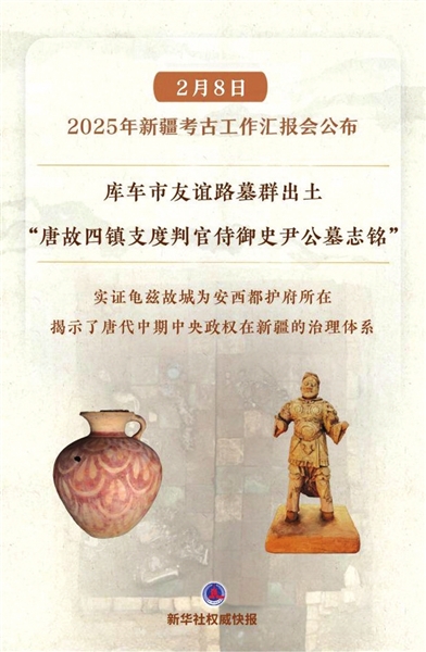 新华社电 2月8日在京举行的2025年新疆考古工作汇报会上,公布了库车市友谊路墓群等“实证历代中央政权有效管辖治理新疆”考古新发现。