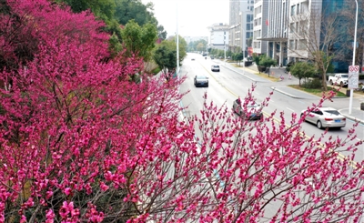 时下,咸宁城区银桂路的红梅盛放,一抹抹嫣红点缀在绿树间,与整洁的街道、错落的楼宇相映成趣,为初春的香城增添几分灵动与暖意,成为街头一道靓丽的风景线。