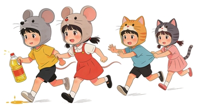 第二局开始了,“猫”加大了对“油”的看管。小明因第一次去偷“油”出师不利,被“猫”抓住成了“猫”。我灵机一动,决定采用三十六计里的“声东击西”这一计。我先派小丽这只“老鼠”引开了洞的守卫——小明,又派凡凡躲进窗帘,监视着“猫”的一举一动。我则挺着大肚子去“偷油”。凡凡把手伸了出来,比了个“OK”的手势,表示安全,我便出洞了。我来到了柱子前,没看见小红和军军。我心想:小红和军军不会就在我身后吧?我伸手摸了十几下“油”,回头一看,呀!小红和军军这两只“猫”果然在我身后。我一边跑,一边喊“大家快跑哇!‘猫’来了!”小丽和凡凡冲了出来,偷走了所有“油”,我们很快把“油”运进了“洞”里。此时,小丽一个脚底打滑,摔在了“家”门口,眼看“猫”就要冲过来了,小丽赶忙站了起来,一个箭步就冲进了“鼠”家。我们“老鼠”欢呼雀跃起来,三只“猫”却耷拉下脑袋……第二局,我们“老鼠”又赢了!