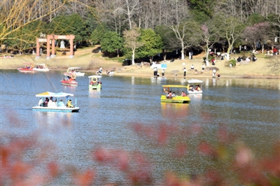2月20日,正月初四,阳光明媚,十六潭公园内游人如织。旋转木马,碰碰车,摩天轮……现代化的游乐设施满是排队等候的市民;园中湖里,市民们带上孩子登上船,徜徉嬉戏在山水间,零距离感受大自然美景。游人们享受着春节期间与亲朋好友相聚出游的美好时光。