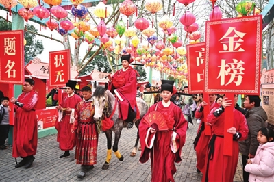 “状元来啦!”随着一声吆喝,身穿红袍、头戴金花的“状元郎”在旗鼓队伍的簇拥下骑马而来。游客们一下子围了上去,争着和“状元”合影,图个好彩头。