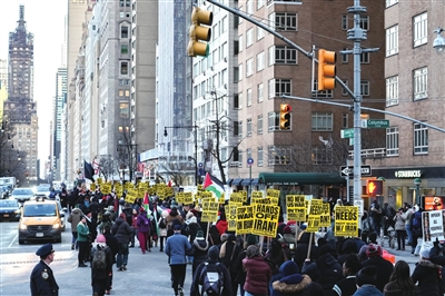 2日傍晚,数百名抗议者冒着严寒在纽约市哥伦布圆形广场集会,组织方代表发表演讲,人们手持标语,大声呼喊反战口号,要求“停止针对伊朗的战争”,随后开始游行示威。