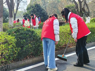 在湖北科技学院校园及周边,“幸福咸宁”志愿服务队的志愿者们手持清洁工具,认真清理卫生死角,捡拾绿化带垃圾,擦拭公共设施,用实际行动美化校园环境,传递文明理念。