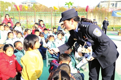 与此同时,旁边的几个孩子围成一圈,民警正用卡通画册讲交通安全。“过马路要看红绿灯,不在马路上追逐打闹……”孩子们抢着举手回答问题,声音一个比一个大。