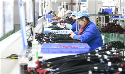 3月4日,咸安经济开发区湖北捷优信达电子有限公司生产车间,工人们正在赶制一批电子线束订单。