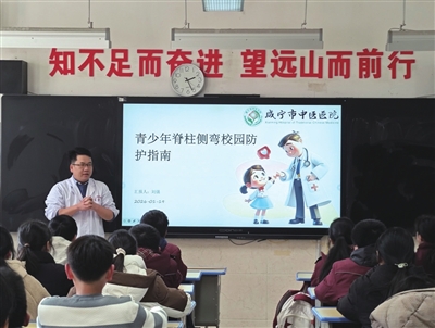 本报讯(记者 叶子 通讯员 游威)为深入落实健康中国行动要求,推进《中国儿童发展纲要“十五五”规划》中儿童青少年脊柱弯曲异常等疾病防治工作落地,守护青少年脊柱健康,近日,市中医医院推拿科走进市实验外国语学校,开展“挺直腰背,自信成长——青少年脊柱侧弯防治进校园科普”活动,为近50名七年级学生及班主任带来了一场干货满满的健康课。