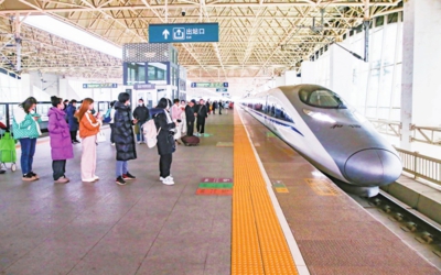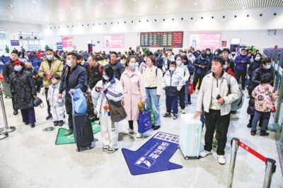 安检口前,排队的旅客井然有序,工作人员在一旁提醒大家将行李放入安检机。检票口的广播声不断响起,“G6824次列车开始检票”的提示音刚落,拿着行李的旅客就快步走向检票闸机。站台上,归家的旅客一个接一个地走向车厢,一列列动车呼啸而过,飞速行驶的列车背后,是家人围炉的期盼,是团聚时刻的温暖。