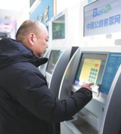 乘客在孝感客运中心使用自助售票机购票。