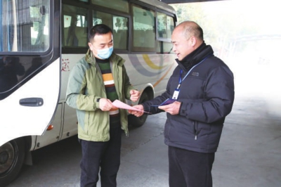 孝感客运中心工作人员在出站口查验驾驶员证件,发放春运安全告知函。