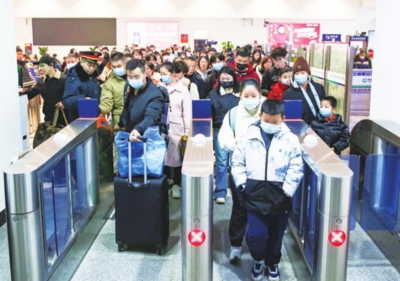 1月14日是春运首日,我市各地客流平稳有序,全力打造“平安春运、便捷春运、温馨春运”。图为乘客在孝感东站检票进站。全媒体记者吴垠摄