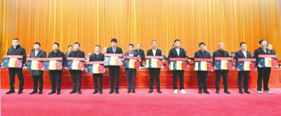 2月6日,全市三级干部大会上,举行标准地出让“五证”同发集中颁证仪式,27家企业现场领证。(全媒体记者李文勇摄)