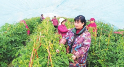 2月7日,在孝南区陡岗镇军里村惠康种养生态农场基地里,工人在温室大棚内修剪西红柿枝条。