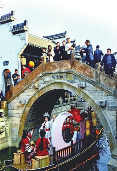 行至古镇后段,一条宽不足十米,长不足一里的水街,恰似灵动的丝带,出现在古建筑画面中间。 有了水,古街立即活了起来,小镇也突然有了魂。 午后的暖阳之中,一只盛装的画舫,载着一名汉服女子在歌唱,那声音婉转嘹亮,歌声回旋在古镇巷子间,引得无数游客驻足聆听。 水街两旁,一边是沿途店铺延展出来可供遮风避雨的长廊,平添了几分人情味;另一边则是青石板路,都不算宽敞,仅够两人错肩而过,三个人并排走,都略显局促。 但是,正是这种紧凑的街道,瞬间就拉近了人与人之间的距离。当你与对面来人擦肩而过时,你立即感受到他的温度。 这般独具匠心的设计,淋漓尽致地展现出中国匠人的睿智与巧思。他们在有限的空间里,却营造出无限的温情与和谐。