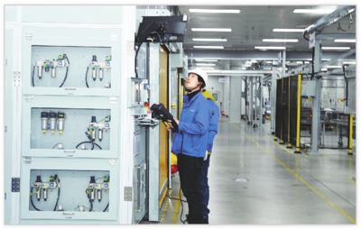 2月22日,在楚能新能源孝感基地测试中心,技术人员正在查看锂电池产品。