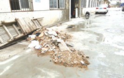 三利路71号附近,居民楼前存在未及时清理的建筑垃圾