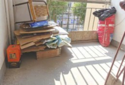 在三利二街10号附近,有居民沿街牵绳晾晒衣物,在墙边堆放旧沙发、旧柜子等杂物,部分居民楼前人行道存在垃圾。