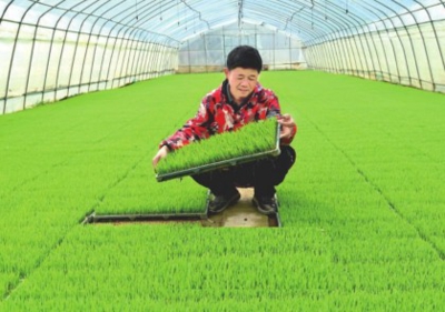 3月27日,在孝南区卧龙乡的民耕农机专业合作社水稻育秧工厂,社员正在智能化育秧基地忙碌于水稻秧苗的查看管护工作。