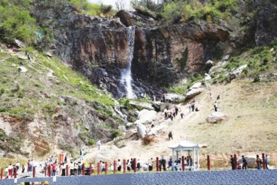 月4日至6日,天气晴好,双峰山游客创下历史新高,超5万人次游客来到景区踏青游春、登高揽胜。图为游客们正在观赏双峰山瀑布。特约记者杨金华摄