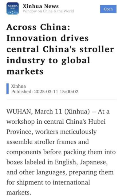3月底,当新华社英文版一篇题为《中国中部婴儿车行业创新驱动,走向全球市场》的报道,重磅推介湖北汉川多功能婴儿车时,这座湖北小城或许没想到,它会首次以“产业地标”的身份进入全球视野。