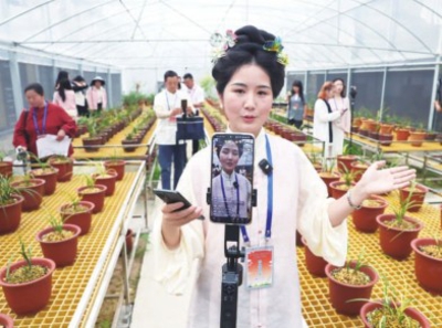 4月9日,大悟县河口镇顺山村兰花盆景产业园,网络主播在直播售卖兰花。当日,以“兰韵茶香云端共赏”为主题的大别山(大悟)首届兰花盆景展开幕,50位网络主播通过现场直播将大悟兰花售卖到全国各地。