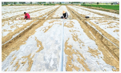 近日,在孝南区陡岗镇朝阳村西瓜田里,农户正在安装浇灌水管。