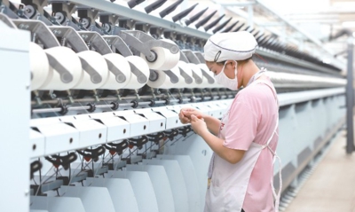 日前,在汉川市马口镇际华三五零九纺织有限公司气流纺生产车间,纱线生产线正有序运转。