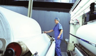 5月12日,位于汉孝产业园的金三发(湖北)医疗卫生材料科技有限公司车间,工人们正在加紧生产。该公司专业生产非织造材料、护理用品、服装粘合衬。目前公司订单不断,产销两旺。全媒体记者李文勇通讯员李全华摄