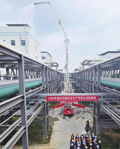 6月13日,孝感市消防救援支队联合湖北回盛生物科技有限公司开展化工企业灭火救援演练。图为模拟火灾发生,园区迅速启动应急预案展开自救,消防救援人员赶赴现场,组织人员有序疏散,控制火势蔓延。全媒体记者李琦特约记者孟畅摄