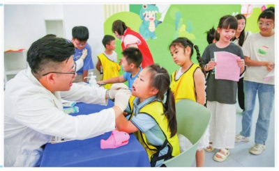 7月3日,市高新区槐荫办事处西杨社区小朋友在社区服务中心检查口腔。