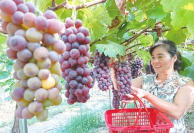游客在燕竹种植场的葡萄园体验采摘乐趣。