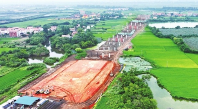 作者: 全媒体记者李文勇 摄 来源:孝感日报 字数:181 8月12日,航拍孝感至汉川一级公路新建工程府河特大桥施工现场。该工程是湖北省综合交通运输发展“十四五”规划的重点项目之一,起于孝南区北京南路,止于汉川市霍城大道,全长约27.97公里,项目建成后将大力带动沿线村庄经济发展,对促进区域交通一体化发展具有重要意义。目前,各施工单位正加班加点,稳步推进项目建设进度。(全媒体记者李文勇摄)