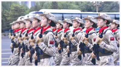 9月3日,纪念中国人民抗日战争暨世界反法西斯战争胜利80周年大会开始前,"00后"孝感姑娘罗馨怡(二排右四)所在的民兵方队在排练。